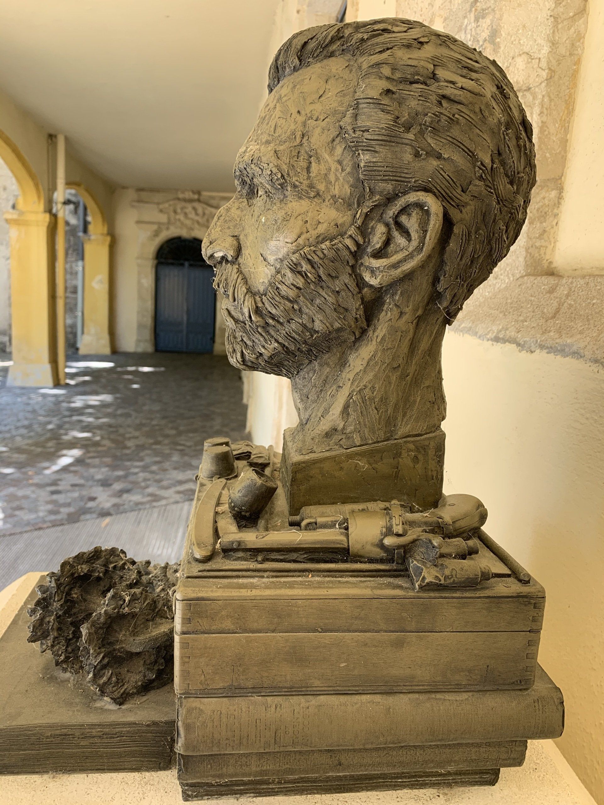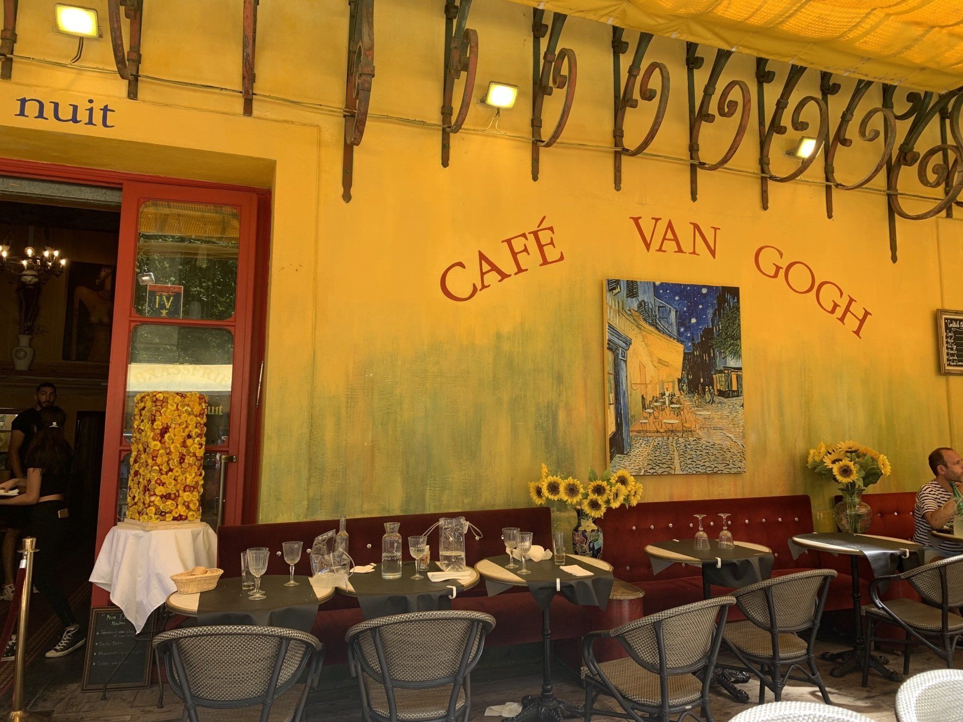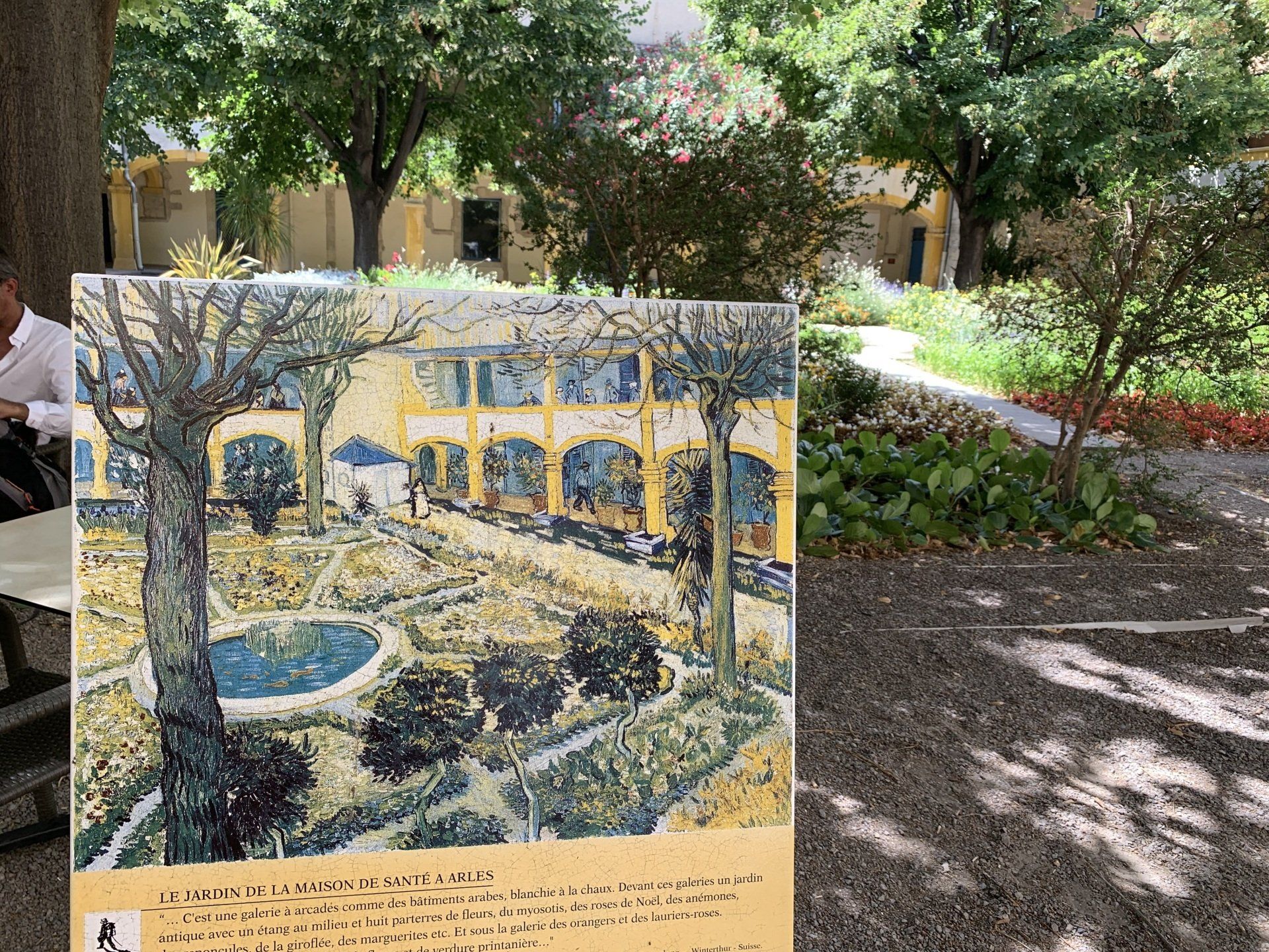 In Arles sta ik opeens voor het restaurant van het befaamde schilderij Le Café de Nuit. De eigenaar heeft er alles aan gedaan om de tijd van toen te behouden. Je ziet gewoon het schilderij tot leven komen. Even verderop kom ik bij het ziekenhuis waar Vincent is opgenomen nadat hij zijn oor heeft afgesneden en opgestuurd naar een prostituee. Dit alles na weer een ruzie met Gauguin. Op de binnenplaats een standbeeld dat alles samenvat. Als je goed kijkt zie je naast verftubes een scheermes - voor het oor - en een pistool - voor het schot in de borst waarmee hij uiteindelijk zichzelf uit zijn lijden verloste. Wrang.